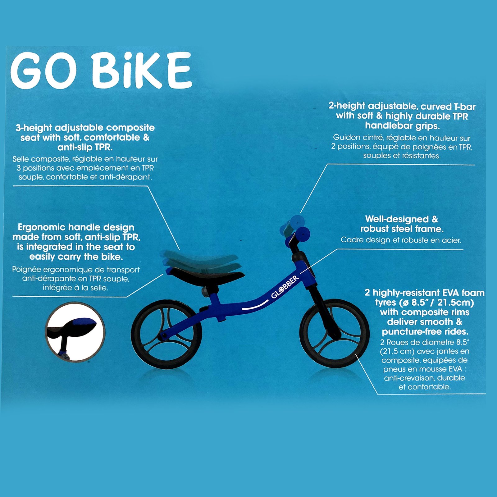 The Globber Go Bike is designed to teach your child essential motor skills and master balance before transitioning to their first pedal bike.